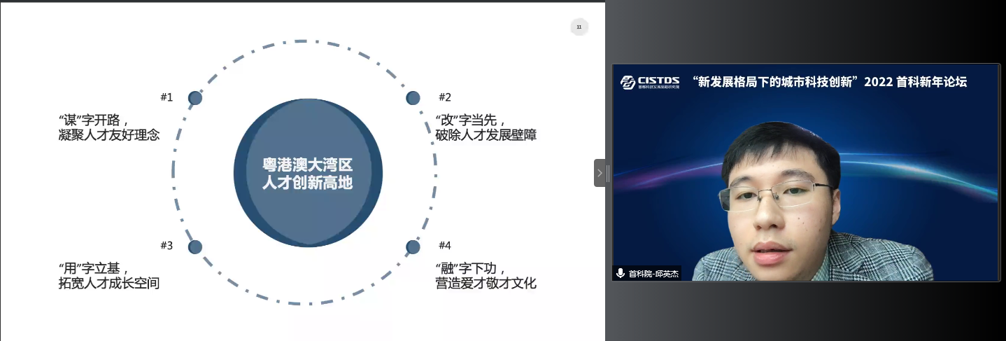 ? ? ? ?首都科技發(fā)展戰(zhàn)略研究院院長助理、研究總監(jiān)劉楊,浙江大學(xué)經(jīng)濟與文化研究中心執(zhí)行主任何春暉,山東大學(xué)管理學(xué)院教授許峰,首都科技發(fā)展戰(zhàn)略研究院院長助理邱英杰作為《中國城市科技創(chuàng)新發(fā)展報告(2021)》課題組代表,分別以《以科學(xué)城為引領(lǐng)構(gòu)建城市融合創(chuàng)新發(fā)展新格局》、《數(shù)字治理賦能智慧城市品牌的浙江樣本——基于杭州“城市大腦”的經(jīng)驗與反思》、《高位嫁接、產(chǎn)學(xué)轉(zhuǎn)型、建設(shè)高地、強力輻射——二線城市科創(chuàng)突圍之路》和《以人才友好型城市建設(shè)為牽引,加快打造粵港澳大灣區(qū)人才創(chuàng)新高地》為題,發(fā)布了專題報告。