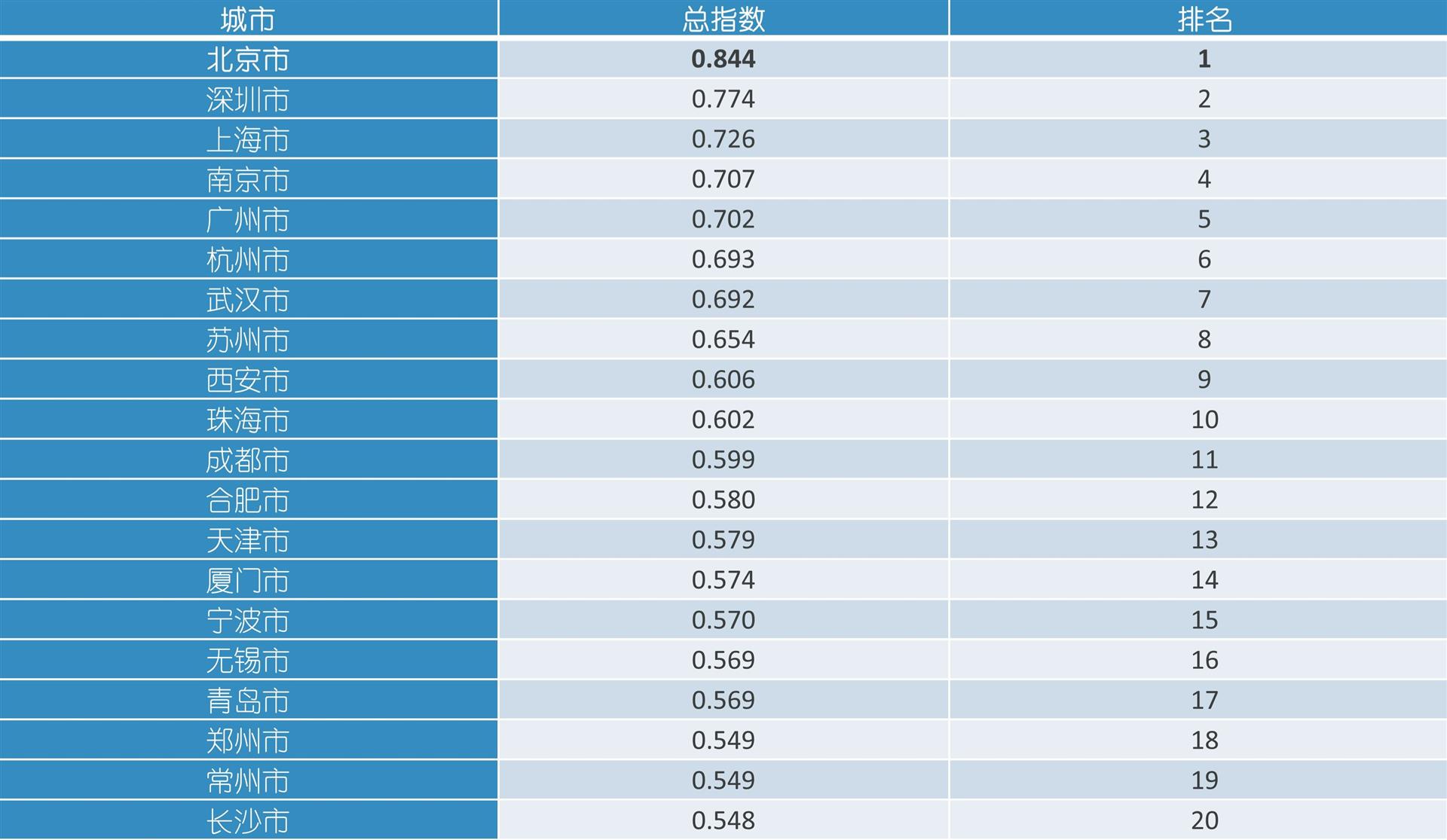 ? ? ? ?《中國城市科技創(chuàng)新發(fā)展報告(2021)》顯示,2021年度中國城市科技創(chuàng)新發(fā)展指數(shù)排名前20位的城市依次是北京市、深圳市、上海市、南京市、廣州市、杭州市、武漢市、蘇州市、西安市、珠海市、成都市、合肥市、天津市、廈門市、寧波市、無錫市、青島市、鄭州市、常州市和長沙市。
