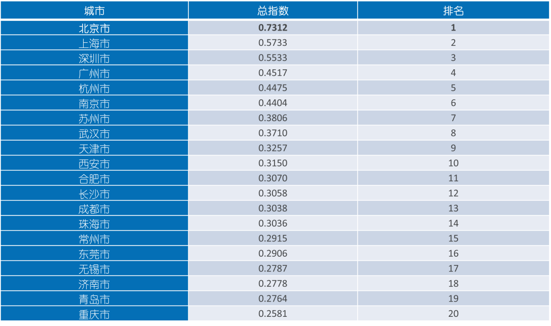? ? ?《中國(guó)城市科技創(chuàng)新發(fā)展報(bào)告(2022)》顯示,2022年,中國(guó)城市科技創(chuàng)新發(fā)展指數(shù)排名前20位的城市依次是北京市、上海市、深圳市、廣州市、杭州市、南京市、蘇州市、武漢市、天津市、西安市、合肥市、長(zhǎng)沙市、成都市、珠海市、常州市、東莞市、無(wú)錫市、濟(jì)南市、青島市和重慶市。其中,北京連續(xù)多年保持第1;上海首次超越深圳,躋身全國(guó)第2;重慶市首次進(jìn)入20強(qiáng)。