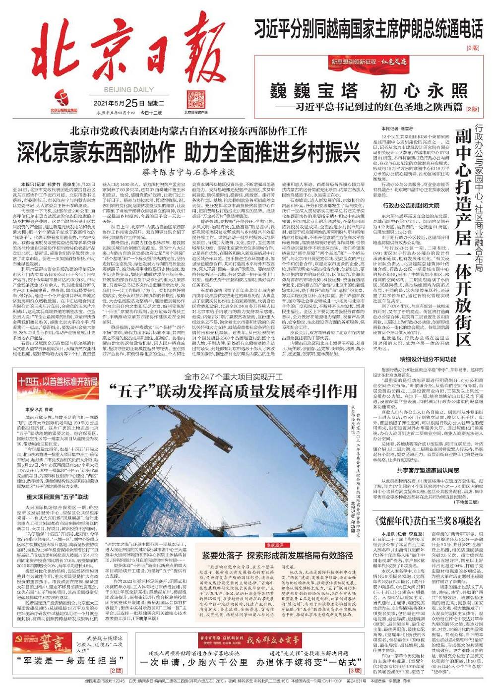2021年5月25日,中共北京市委機關報《北京日報》頭版刊發《全市247個重大項目實現開工? “五子”聯動發揮高質量發展牽引作用》一文,邀請首都科技發展戰略研究院院長關成華教授做專家點評。