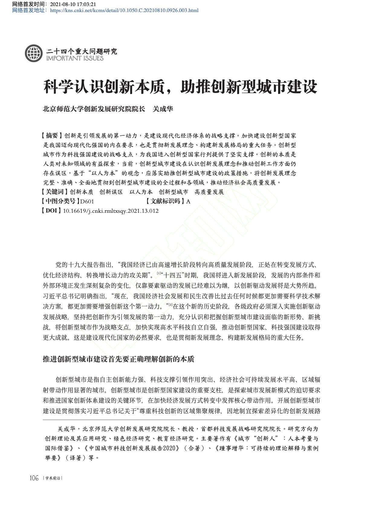 2021年8月10日,首都科技發展戰略研究院院長關成華教授在《人民論壇·學術前沿》,發表理論文章《科學認識創新的本質 助推創新型城市建設》。