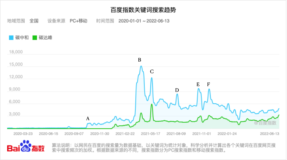 ? ? ? 進一步分析2020年9月22日之后的百度指數數據,我們發現,幾個主要峰值都和中央政府工作會議、重要文件和國家領導人在重大場合講話有很強的一致性。A點對應2020年9月22日習近平主席在第七十五屆聯合國大會一般性辯論上的講話,首次做出碳達峰碳中和目標表述;B點對應2021年3月15日中央財經委員會第九次會議,指出:“我國力爭2030年前實現碳達峰,2060年前實現碳中和,是黨中央經過深思熟慮作出的重大戰略決策,事關中華民族永續發展和構建人類命運共同體”;C點對應2021年4月22日習近平主席出席領導人氣候峰會,并發表題為《共同構建人與自然生命共同體》的重要講話,指出:“中國將嚴控煤電項目,“十四五”時期嚴控煤炭消費增長、“十五五”時期逐步減少。此外,中國已決定接受《〈蒙特利爾議定書〉基加利修正案》,加強非二氧化碳溫室氣體管控,還將啟動全國碳市場上線交易”;D點對應2021年7月16日,全國碳排放權交易市場上線交易啟動;E點對應2021年9月21日習近平主席出席第七十六屆聯合國大會一般性辯論,指出“中國將力爭2030年前實現碳達峰、2060年前實現碳中和,這需要付出艱苦努力,但我們會全力以赴。中國將大力支持發展中國家能源綠色低碳發展,不再新建境外煤電項目”;F點對應2021年10月24日中共中央 國務院發布《中共中央 國務院關于完整準確全面貫徹新發展理念做好碳達峰碳中和工作的意見》,國務院印發《2030年前碳達峰行動方案》。見圖1。