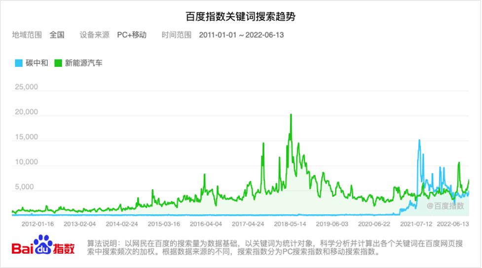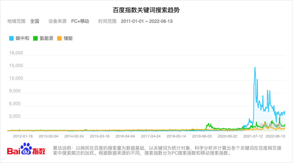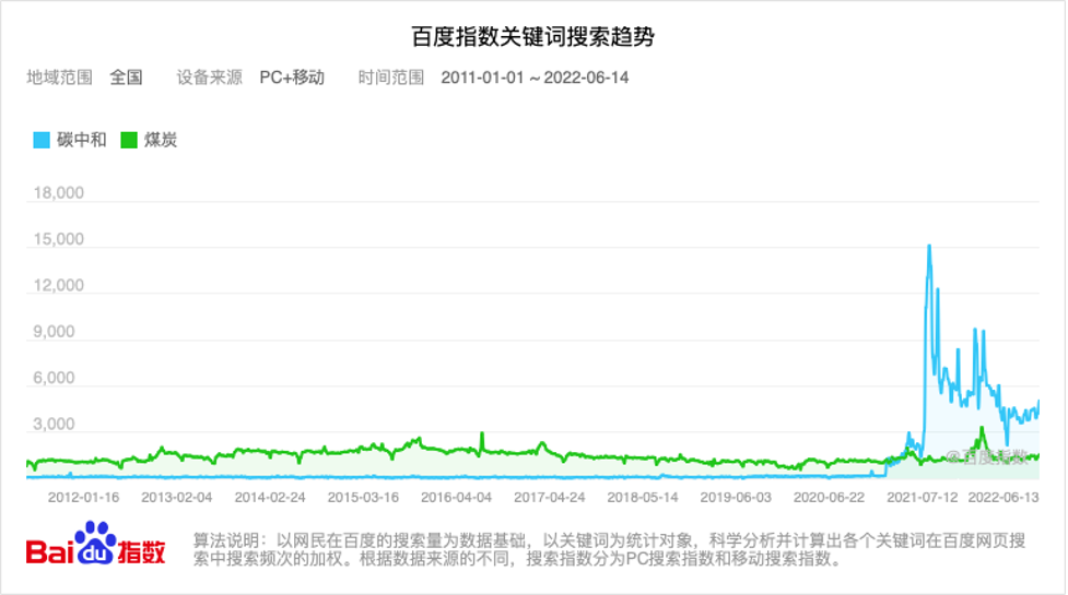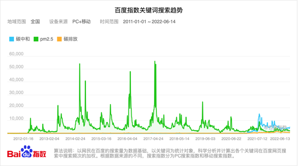 ? ? ??碳中和作為一種敘事,經歷了多年的爭論,現在似乎已經走到了舞臺正中,成為了大部分人認可的故事。敘事離不開大眾,我們試圖用百度指數來做一個有意思的分析,權作拋磚引玉吧。文章選取的時間周期是2011年1月1日(這是百度指數最早的時間)到2022年6月13日(這是我們研究數據統計的截止時間);研究對象是百度指數中“碳中和”及相關的關鍵詞的搜索次數;研究方法主要是描述性的統計比較分析,結合對團隊內部的小組訪談。