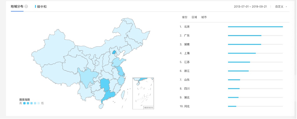 ? ? ? 百度指數還提供了搜索來源地區的信息。我們將把時間劃分為兩段,以習近平主席提出碳達峰碳中和目標為主要分界點。我們發現,在分界點前,最關注的地區是北京、廣東、湖南、上海和江蘇,其中北京更是大幅領先。在分界點后,最關注的地區是廣東、北京、江蘇、上海和浙江。我們的猜想是北京由于是中央政府所在地和研究機構集聚地,因此在碳中和沒有成為國家戰略前,主要作為研究對象在關注;成為國家戰略后,特別是對產業產生了巨大影響后,珠三角和長三角明顯跟進速度加快。如果考慮到人均點擊量,北京應該還是領先全國的。詳見圖6和7。