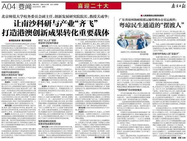 ? ? ? 2022年9月26日,首都科技發(fā)展戰(zhàn)略研究院院長關成華教授接受《南方日報》專訪時表示,南沙背靠廣州,擁有豐富的創(chuàng)新資源,且毗鄰佛山、東莞,未來應借助周邊制造業(yè)優(yōu)勢和香港高校的創(chuàng)新優(yōu)勢,聚焦智能汽車、機器人、云計算等領域,將南沙打造成為港澳創(chuàng)新成果轉(zhuǎn)化的重要載體。