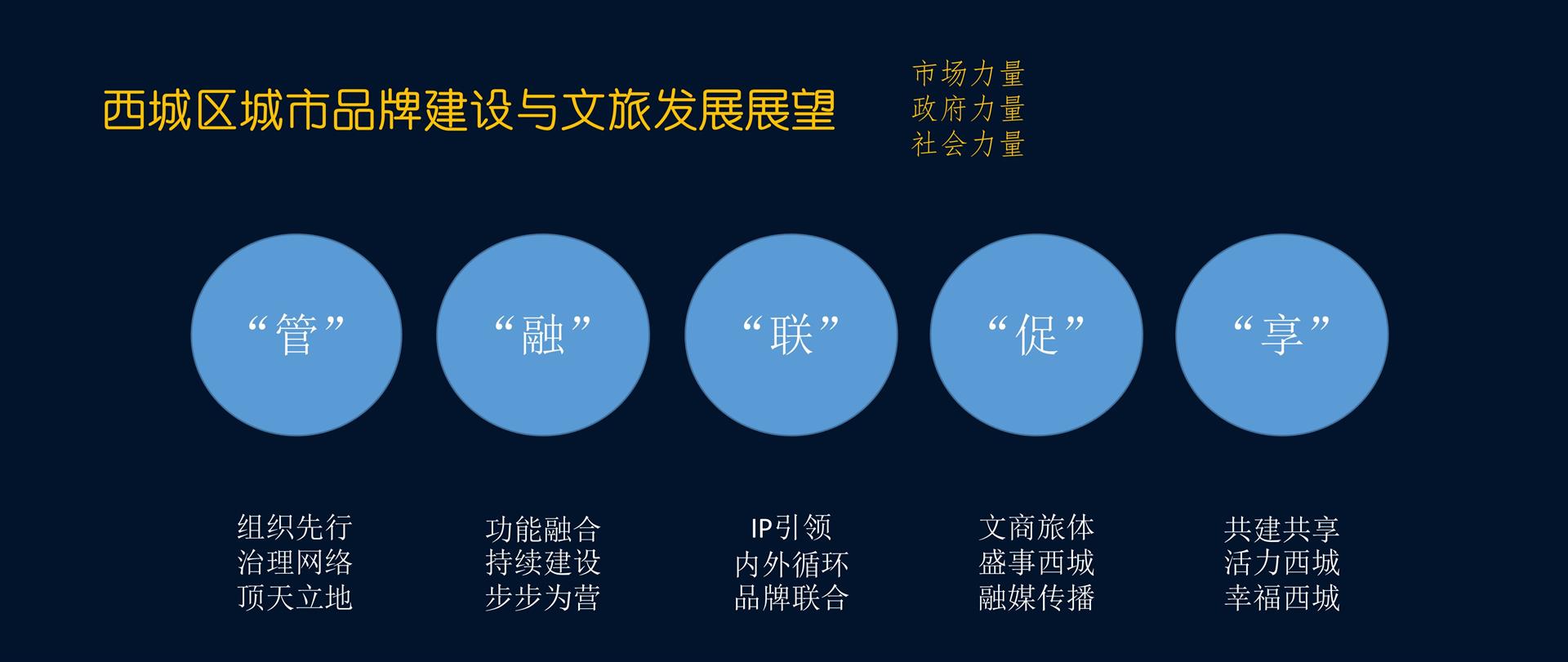 ? ? ? ?一是“管”,即完善城市品牌建設的現(xiàn)代管理和管治體系,通過組織先行和治理網(wǎng)絡建設,形成既有頂層設計、又有項目落地管理的“頂天立地”新格局。二是“融”,城市文旅品牌建設要透過文旅來關(guān)照整個西城區(qū)的發(fā)展,這就需要把西城區(qū)的產(chǎn)業(yè)品牌、營商環(huán)境品牌、科創(chuàng)品牌、開放品牌和宜居品牌建設等,都納入到文旅品牌的戰(zhàn)略生態(tài)視野,實現(xiàn)城市功能的高效聯(lián)動,并以此來催生更多的規(guī)劃和創(chuàng)意。三是“聯(lián)”,即以IP打造為引領(lǐng),與國內(nèi)外城市、產(chǎn)業(yè)和企業(yè)品牌聯(lián)動,開展聯(lián)合營銷,以充分彰顯北京市作為國家中心城市在構(gòu)建新發(fā)展格局中的引領(lǐng)作用并作出西城貢獻。四是“促”,即在前三個增長和增量戰(zhàn)略基礎(chǔ)上,通過盛事西城打造和媒體整合傳播,有效促進文商旅體消費,同時增益城市品牌資產(chǎn)。五是“享”,即始終堅守城市品牌與文旅發(fā)展的公共利益價值導向,不斷深化城市品牌的共建共享機制,賦能活力西城和幸福西城建設。