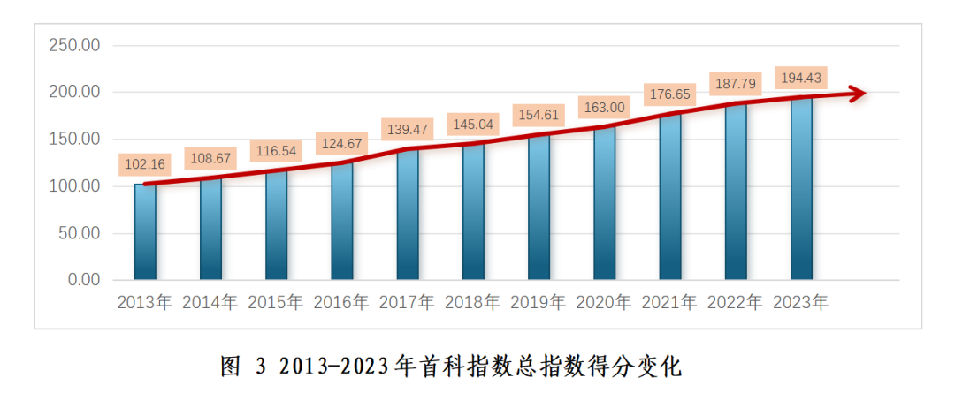 “首科指數2024”顯示,2013-2023年,首科指數增長態勢明顯,總指數得分從2013年的102.16分增長到2023年的194.43分,增幅達92.31%,年均增長8.48分,年均增長率達6.76%。